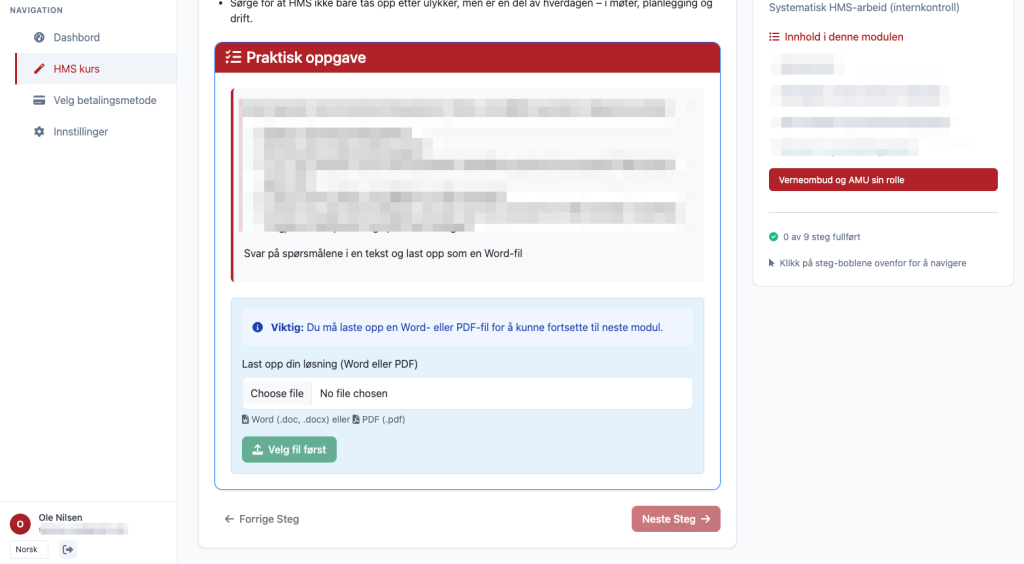40-timerskurset gjennomføres på nett og på din egen arbeidsplass gjennom praktiske oppgaver. Kurset består av 9 moduler som dekker kravene fra myndighetene.