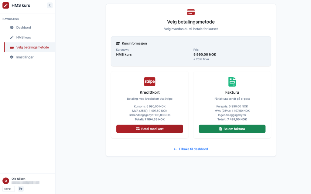 For at kursbeviset skal bli tilgjengelig må kursavgiften betales. Dette kan gjøres enten på nett (kort, klarna etc.) eller med faktura.